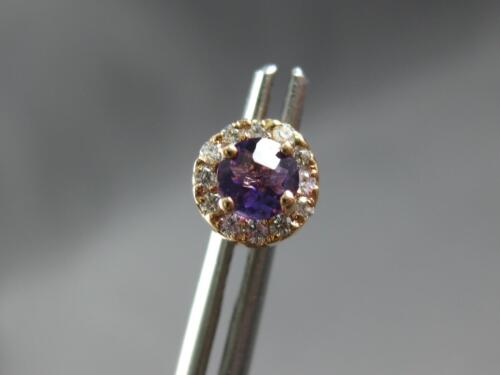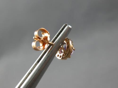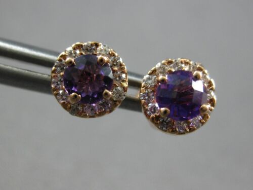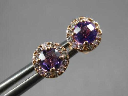 14KT ROSE GOLD STUD EARRINGS. 3D CLASSIC HALO FLOWER DESIGN. ROUND DIAMONDS ARE F/G COLOR, VSSI CLARITY .18 CARATS. AAA EXTRA FACTED ROUND AMETHYSTS ARE .50 CARATS. MEASURES 6.5mm WIDE. WRITTEN APPRAISAL AVAILABLE. COMES IN A PRESENTABLE GIFT BOX.