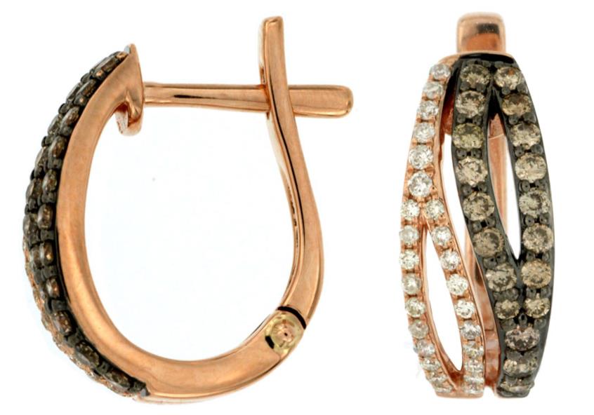 14KT ROSE GOLD LEVERBACK HANGING EARRINGS. 3D DOUBLE LEAF CRISS CROSS DESIGN. WHITE DIAMONDS ARE F/G COLOR, VSSI CLARITY .22 CARATS. CHOCOLATE FANCY DIAMONDS ARE .46 CARATS. WRITTEN APPRAISAL AVAILABLE. COMES IN A PRESENTABLE GIFT BOX.