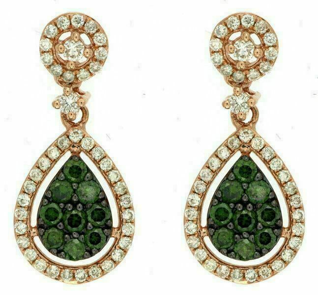14KT ROSE GOLD HANGING EARRINGS. 3D CLUSTER TEAR DROP HALO DESIGN. WHITE DIAMONDS ARE F/G COLOR, VSSI CLARITY .30 CARATS. PEAR SHAPE GREEN DIAMONDS ARE .38 CARATS. WRITTEN APPRAISAL AVAILABLE. COMES IN A PRESENTABLE GIFT BOX.