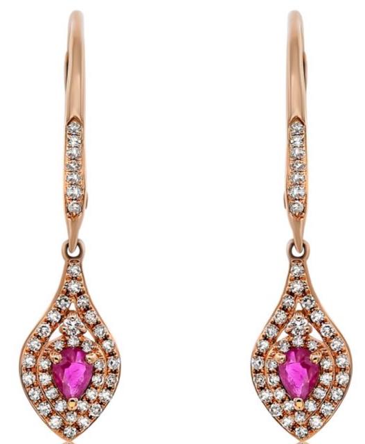 14KT ROSE GOLD LEVERBACK HANGINGEARRINGS. 3D TEAR DROPDESIGN. ROUND DIAMONDS ARE F/G COLOR, VSSI CLARITY .33CARATS. AAAOVAL RUBIES ARE .36 CARATS.WRITTEN APPRAISAL AVAILABLE. COMES IN A PRESENTABLE GIFT BOX.