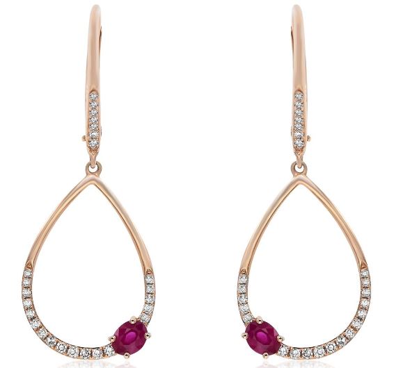 14KT ROSEGOLD FUN HANGINGEARRINGS. 3D SOLITAIRE TEAR DROPDESIGN. DIAMONDS ARE F/G COLOR, VSSI CLARITY .19CARATS. AAA RUBIESARE .50 CARATS.WRITTEN APPRAISAL AVAILABLE. COMES IN A PRESENTABLE GIFT BOX.