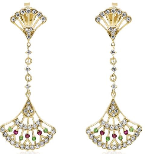 14KT YELLOWGOLD FUN HANGINGEARRINGS. 3D FILIGREE BY THE YARDDESIGN. DIAMONDS ARE F/G COLOR, VSSI CLARITY .56CARATS. AAA RUBIES ARE .06 CARATS. AAA TSAVORITES ARE .07 CARATS.WRITTEN APPRAISAL AVAILABLE. COMES IN A PRESENTABLE GIFT BOX.