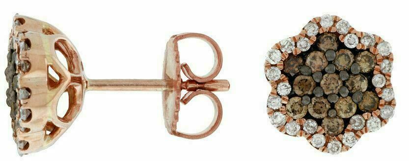 14KT ROSE GOLD STUD EARRINGS. 3D CLUSTER FLOWER STAR DESIGN. WHITE DIAMONDS ARE F/G COLOR, VSSI CLARITY .24 CARATS. CHOCOLATE FANCY DIAMONDS ARE .45 CARATS. WRITTEN APPRAISAL AVAILABLE. COMES IN A PRESENTABLE GIFT BOX.
