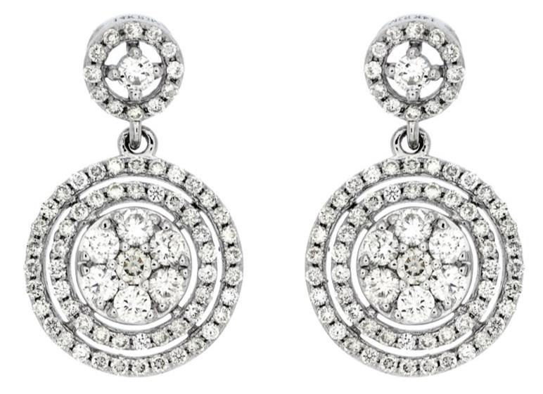 14KT WHITE GOLD HANGING EARRINGS. 3D FLOWER DOUBLE HALO CLASSIC DESIGN. DIAMONDS ARE F/G COLOR, VSSI CLARITY .86 CARATS. WRITTEN APPRAISAL AVAILABLE. COMES IN A PRESENTABLE GIFT BOX.