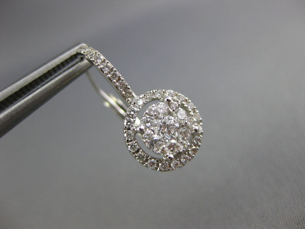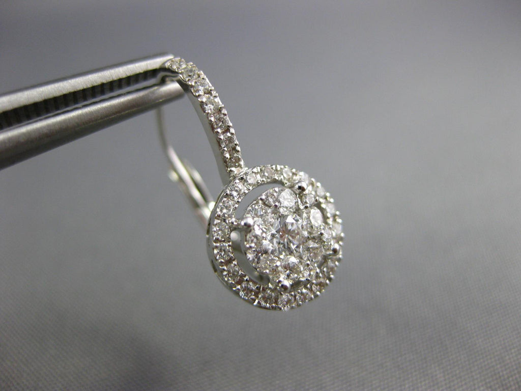 18KT WHITE GOLD LEVERBACK HANGING EARRINGS. 3D CLUSTER ROUND HALO FLOWER DESIGN. DIAMONDS ARE F/G COLOR, VSSI CLARITY .86 CARATS. MEASURES 9mm X 18mm. WRITTEN APPRAISAL AVAILABLE. COMES IN A PRESENTABLE GIFT BOX.