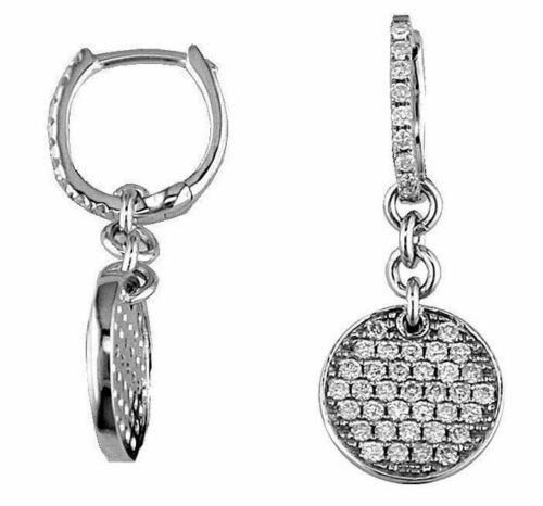 14KT WHITE GOLD HUGGIE HANGING EARRINGS. 3D PAVE ROUND CIRCULAR DESIGN. DIAMONDS ARE F/G COLOR, VSSI CLARITY .70 CARATS. WRITTEN APPRAISAL AVAILABLE. COMES IN A PRESENTABLE GIFT BOX.