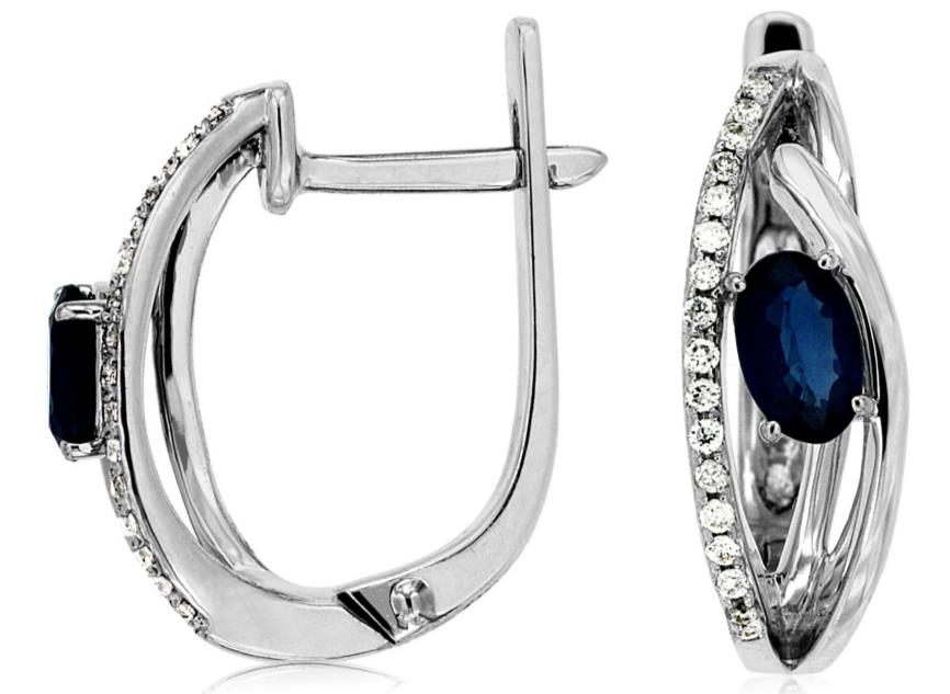 14KT WHITE GOLD LEVERBACK HANGING EARRINGS. 3D CLASSIC DESIGN. ROUND DIAMONDS ARE F/G COLOR, VSSI CLARITY .10 CARATS. AAA OVAL SAPPHIRE ARE .60 CARATS.  WRITTEN APPRAISAL AVAILABLE. COMES IN A PRESENTABLE GIFT BOX.