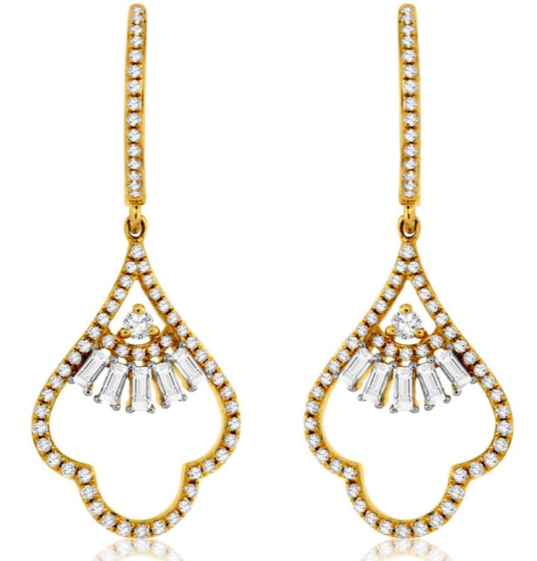 14KT YELLOW GOLD HANGING EARRINGS. 3D FLOWER TEAR DROP DESIGN. DIAMONDS ARE F/G COLOR, VSSI CLARITY. ROUND DIAMONDS ARE .46 CARATS. BAGUETTE DIAMONDS ARE .27 CARATS. WRITTEN APPRAISAL AVAILABLE. COMES IN A PRESENTABLE GIFT BOX.
