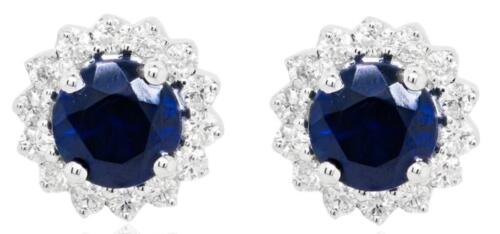 14KT WHITE GOLD STUD EARRINGS. 3D FLOWER HALO DESIGN. ROUND DIAMONDS ARE F/G COLOR, VSSI CLARITY .14 CARATS. AAA ROUND SAPPHIRES ARE .60 CARATS. WRITTEN APPRAISAL AVAILABLE. COMES IN A PRESENTABLE GIFT BOX.