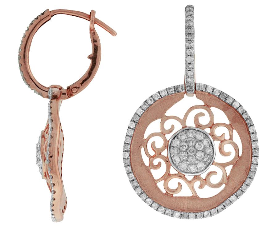 14KT ROSE GOLD HUGGIE LEVERBACK HANGING EARRINGS. 3D OPEN FILIGREE CIRCULAR DESIGN. DIAMONDS ARE F/G COLOR, VSSI CLARITY .75 CARATS. WRITTEN APPRAISAL AVAILABLE. COMES IN A PRESENTABLE GIFT BOX.
