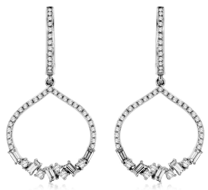 14KT WHITE GOLD LEVERBACK HANGING EARRINGS. 3D HERSHEYS TEAR DROP DESIGN. DIAMONDS ARE F/G COLOR, VSSI CLARITY. ROUND DIAMONDS ARE .45 CARATS. BAGUETTE DIAMONDS ARE .30 CARATS. WRITTEN APPRAISAL AVAILABLE. COMES IN A PRESENTABLE GIFT BOX.