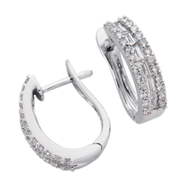 14KT WHITE GOLD LEVERBACK HANGING EARRINGS. 3D THREE ROW CLASSIC DESIGN. DIAMONDS ARE F/G COLOR, VSSI CLARITY. ROUND DIAMONDS ARE .35 CARATS. BAGUETTE DIAMONDS ARE .40 CARATS. WRITTEN APPRAISAL AVAILABLE. COMES IN A PRESENTABLE GIFT BOX.