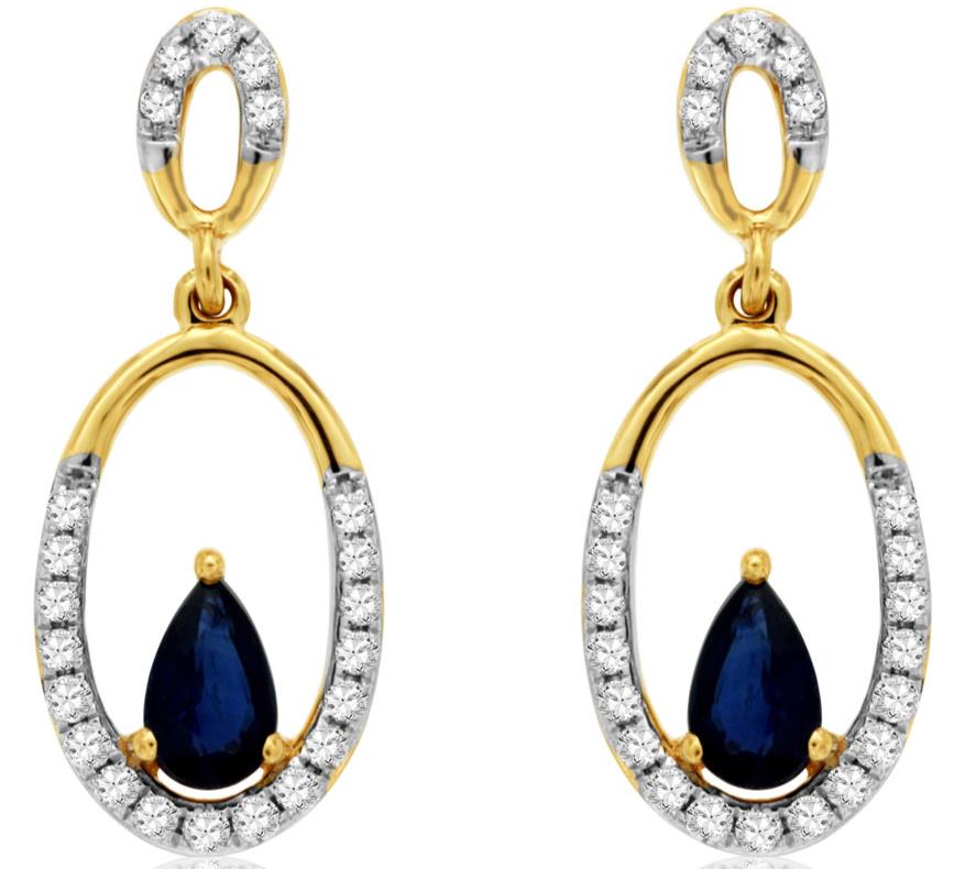14KT YELLOW GOLD HANGING EARRINGS. 3D OVAL DESIGN. ROUND DIAMONDS ARE F/G COLOR, VSSI CLARITY .20 CARATS. AAA PEAR SHAPE SAPPHIRES ARE .55 CARATS. WRITTEN APPRAISAL AVAILABLE. COMES IN A PRESENTABLE GIFT BOX.