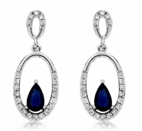 14KT WHITE GOLD HANGING EARRINGS. 3D OVAL TEAR DROP DESIGN. DIAMONDS ARE F/G COLOR, VSSI CLARITY .20 CARATS. AAA PEAR SHAPE SAPPHIRES ARE .55 CARATS. WRITTEN APPRAISAL AVAILABLE. COMES IN A PRESENTABLE GIFT BOX.