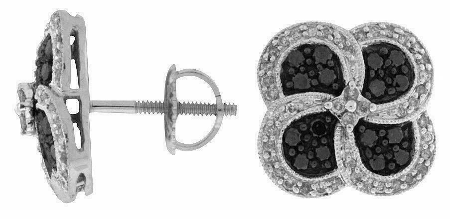 14KT WHITE GOLD SCREW BACK EARRINGS. 3D FOUR LEAF CLOVER FLOWER DESIGN. WHITE DIAMONDS ARE F/G COLOR, VSSI CLARITY .33 CARATS. BLACK DIAMONDS ARE .43 CARATS. WRITTEN APPRAISAL AVAILABLE. COMES IN A PRESENTABLE GIFT BOX.