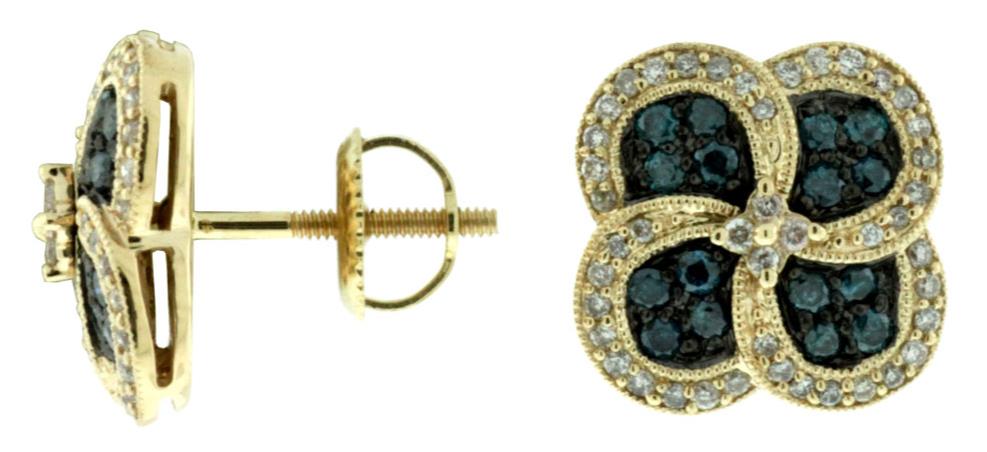 14KT YELLOW AND BLACK GOLD SCREWBACK EARRINGS. 3D FOUR LEAF CLOVER FLOWER DESIGN. WHITE DIAMONDS ARE F/G COLOR, VSSI CLARITY .33 CARATS. BLUE DIAMONDS ARE .43 CARATS. WRITTEN APPRAISAL AVAILABLE. COMES IN A PRESENTABLE GIFT BOX.