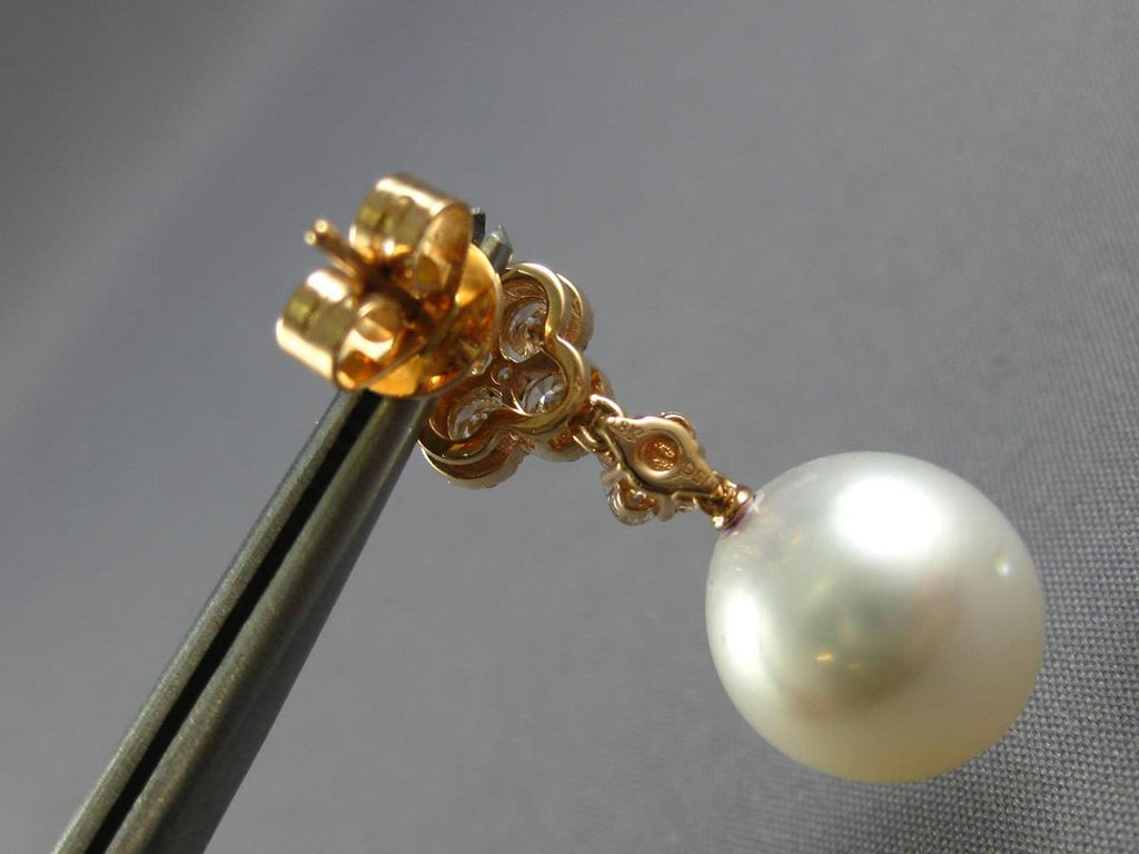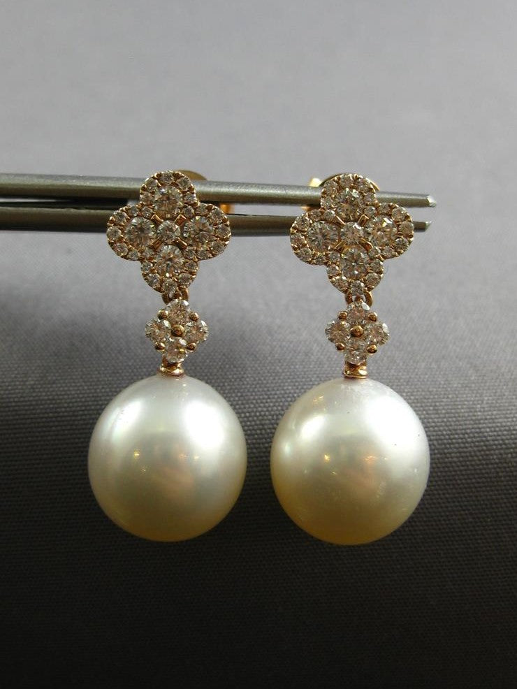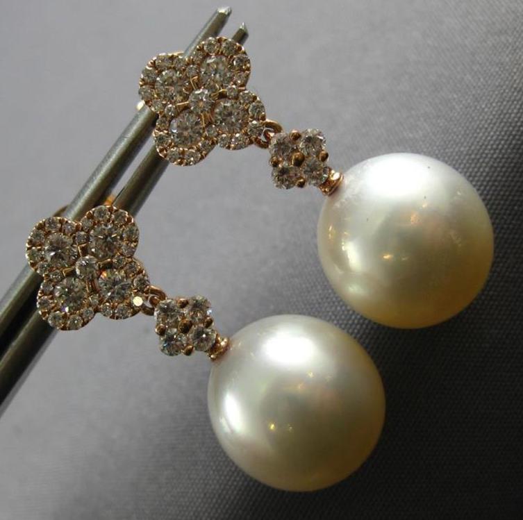 18KT ROSE GOLD HANGING EARRINGS. 3D FOUR LEAF CLOVER FLOWER DESIGN. DIAMONDS ARE F/G COLOR, VSSI CLARITY .77 CARATS. FEATURES 11.5mm WIDE AAA SOUTH SEA PEARLS. EARRINGS MEASURE 26mm X 11.5mm. WRITTEN APPRAISAL AVAILABLE. COMES IN A PRESENTABLE GIFT BOX.