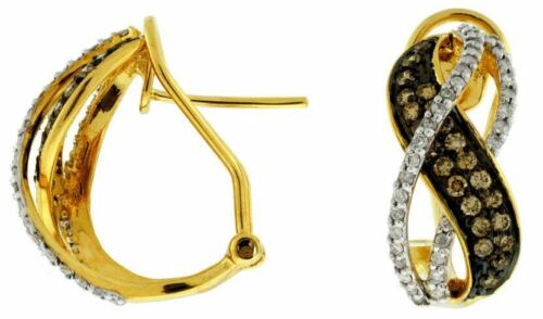 14KT YELLOW GOLD CLIP ON LOVE EARRINGS. 3D MULTI ROW X DESIGN. WHITE DIAMONDS ARE F/G COLOR, VSSI CLARITY .27 CARATS. CHOCOLATE FANCY DIAMONDS ARE .50 CARATS. WRITTEN APPRAISAL AVAILABLE. COMES IN A PRESENTABLE GIFT BOX.