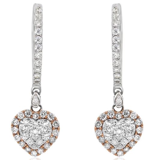 18KT WHITE AND ROSEGOLD HANGINGEARRINGS. 3D CLUSTER HEART SHAPE PAVE CLASSICDESIGN. WHITEDIAMONDS ARE F/G COLOR, VSSI CLARITY .51 CARATS. PINK DIAMONDSARE .26 CARATS.WRITTEN APPRAISAL AVAILABLE. COMES IN A PRESENTABLE GIFT BOX.