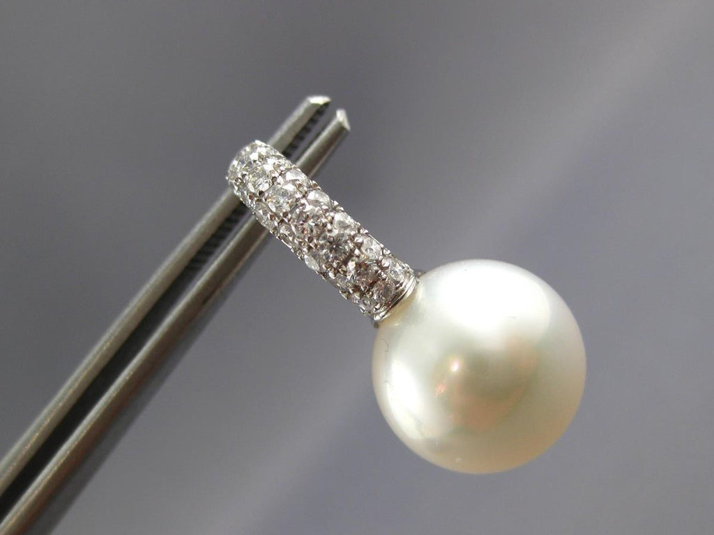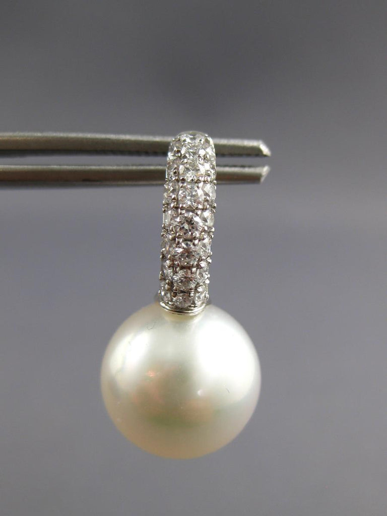 18KT WHITE GOLD HUGGIE HANGING EARRINGS. 3D CLASSIC DESIGN. DIAMONDS ARE F/G COLOR, VSSI CLARITY .78 CARATS. FEATURES 12mm WIDE AAA SOUTH SEA PEARLS. EARRINGS MEASURE 23mm X 12mm. WRITTEN APPRAISAL AVAILABLE. COMES IN A PRESENTABLE GIFT BOX.