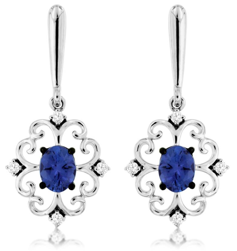 14KT WHITE GOLD HANGING EARRINGS. 3D MULTI HEART FLOWER DESIGN. DIAMONDS ARE F/G COLOR, VSSI CLARITY .08 CARATS. AAA OVAL TANZANITES ARE .70 CARATS. WRITTEN APPRAISAL AVAILABLE. COMES IN A PRESENTABLE GIFT BOX.