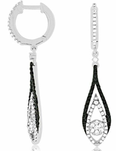 .78CT WHITE & BLACK DIAMOND 14KT WHITE GOLD 3D TEAR DROP FLOWER HANGING EARRINGS