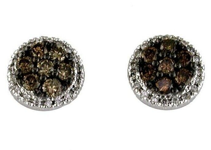 14KT WHITE GOLD STUD EARRINGS. 3D CLASSIC CLUSTER FLOWER HALO DESIGN. WHITE DIAMONDS ARE F/G COLOR, VSSI CLARITY .16 CARATS. CHOCOLATE FANCY DIAMONDS ARE .62 CARATS. WRITTEN APPRAISAL AVAILABLE. COMES IN A PRESENTABLE GIFT BOX.
