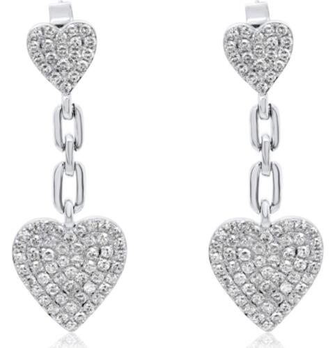 14KT WHITE GOLD LOVE HANGING EARRINGS. 3D DOUBLE HEART MULTI LINK DESIGN. DIAMONDS ARE F/G COLOR, VSSI CLARITY .79 CARATS. WRITTEN APPRAISAL AVAILABLE. COMES IN A PRESENTABLE GIFT BOX.