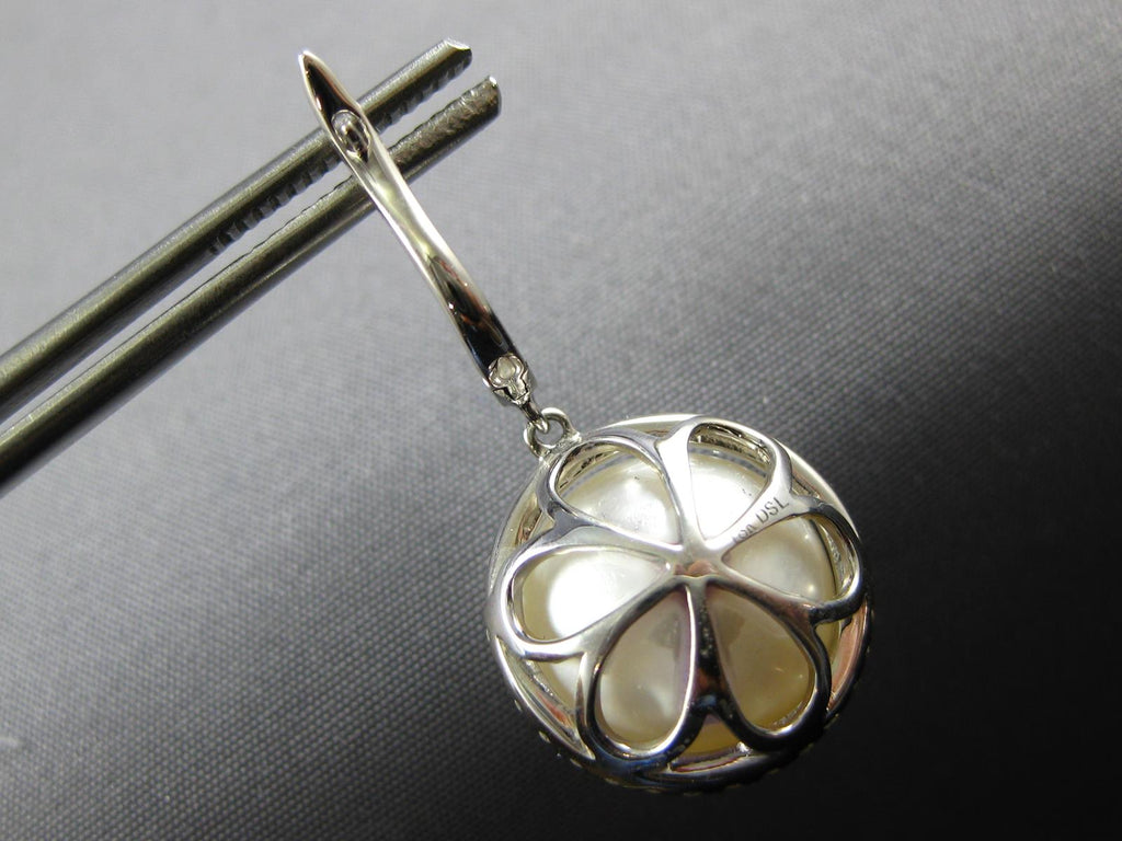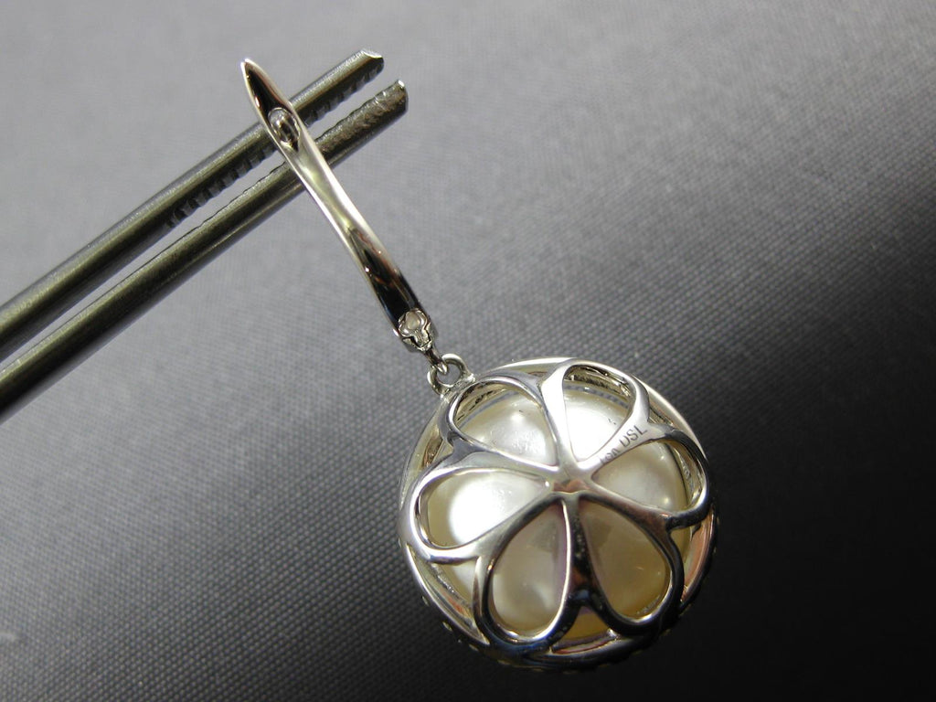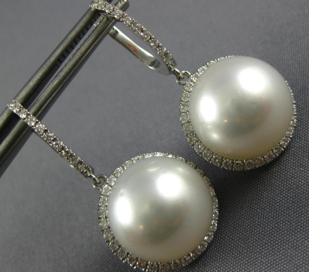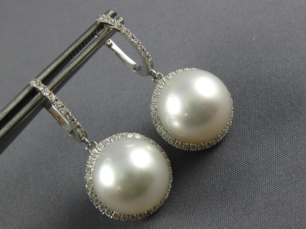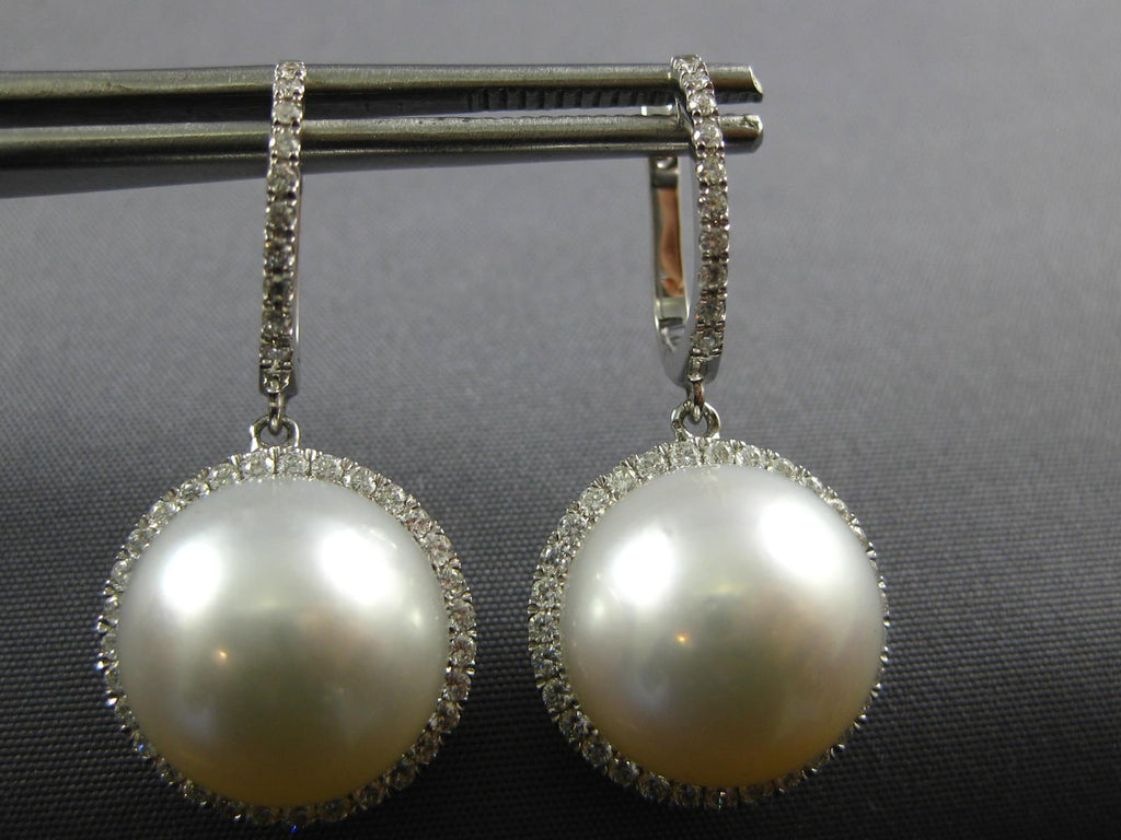 18KT WHITE GOLD LEVERBACK HANGING EARRINGS. 3D HALO DESIGN. DIAMONDS ARE F/G COLOR, VS CLARITY .67 CARATS. FEATURES AAA SOUTH SEA PEARL. MEASURES 29mm X 12.5mm. WRITTEN APPRAISAL AVAILABLE. COMES IN A PRESENTABLE GIFT BOX.