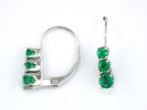14KT WHITE GOLD LEVERBACK EARRINGS. 3D JOURNEY DESIGN. AAA ROUND EMERALDS ARE .80 CARATS. WRITTEN APPRAISAL AVAILABLE. COMES IN A PRESENTABLE GIFT BOX.