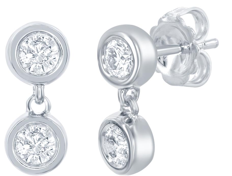 14KT WHITE GOLD FUN HANGING EARRINGS. 3D CLASSIC TWO STONE BEZEL DESIGN. ROUND DIAMONDS ARE F/G COLOR, VSSI CLARITY .80 CARATS. MEASURES 6mm WIDE. WRITTEN APPRAISAL AVAILABLE. COMES IN A PRESENTABLE GIFT BOX.