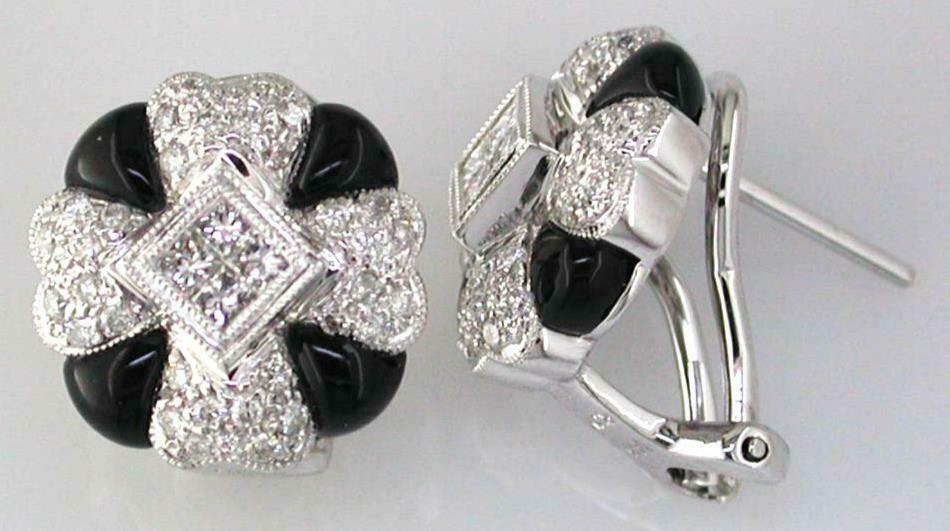.80CT DIAMOND & AAA ONYX 14KT WHITE GOLD 3D PRINCESS FLOWER CLIP ON EARRINGS