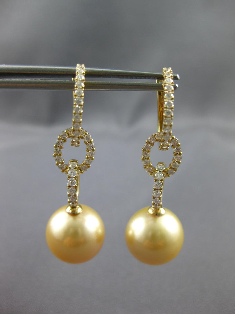 18KT YELLOW GOLD HANGING EARRINGS. 3D LOVE KNOT DESIGN. DIAMONDS ARE F/G COLOR, VSSI CLARITY .81 CARATS. FEATURES 13mm WIDE AAA GOLDEN SOUTH SEA PEARLS. EARRINGS MEASURE 41mm X 13mm. WRITTEN APPRAISAL AVAILABLE. COMES IN A PRESENTABLE GIFT BOX.