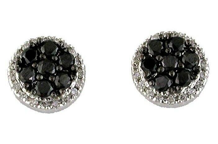 14KT WHITE GOLD STUD EARRINGS. 3D CLASSIC CLUSTER FLOWER HALO DESIGN. WHITE DIAMONDS ARE F/G COLOR, VSSI CLARITY .16 CARATS. BLACK DIAMONDS ARE .65 CARATS. WRITTEN APPRAISAL AVAILABLE. COMES IN A PRESENTABLE GIFT BOX.