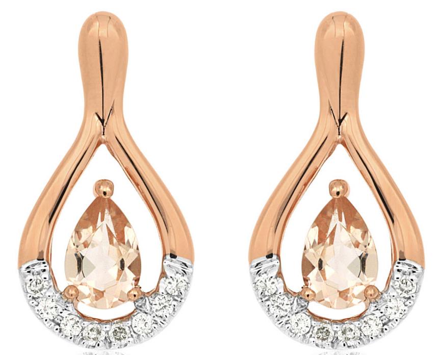 14KT ROSE GOLD HANGING EARRINGS. 3D TEAR DROP DESIGN. ROUND DIAMONDS ARE F/G COLOR, VSSI CLARITY .12 CARATS. AAA PEAR SHAPE MORGANITES ARE .70 CARATS. WRITTEN APPRAISAL AVAILABLE. COMES IN A PRESENTABLE GIFT BOX.