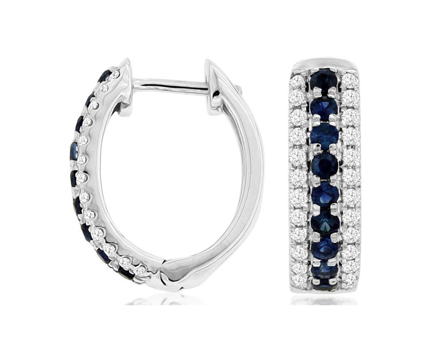 14KT WHITE GOLD HUGGIE HANGING EARRINGS. 3D OVAL DESIGN. DIAMONDS ARE F/G COLOR, VSSI CLARITY .32 CARATS. AAA ROUND SAPPHIRES ARE .50 CARATS. WRITTEN APPRAISAL AVAILABLE. COMES IN A PRESENTABLE GIFT BOX.