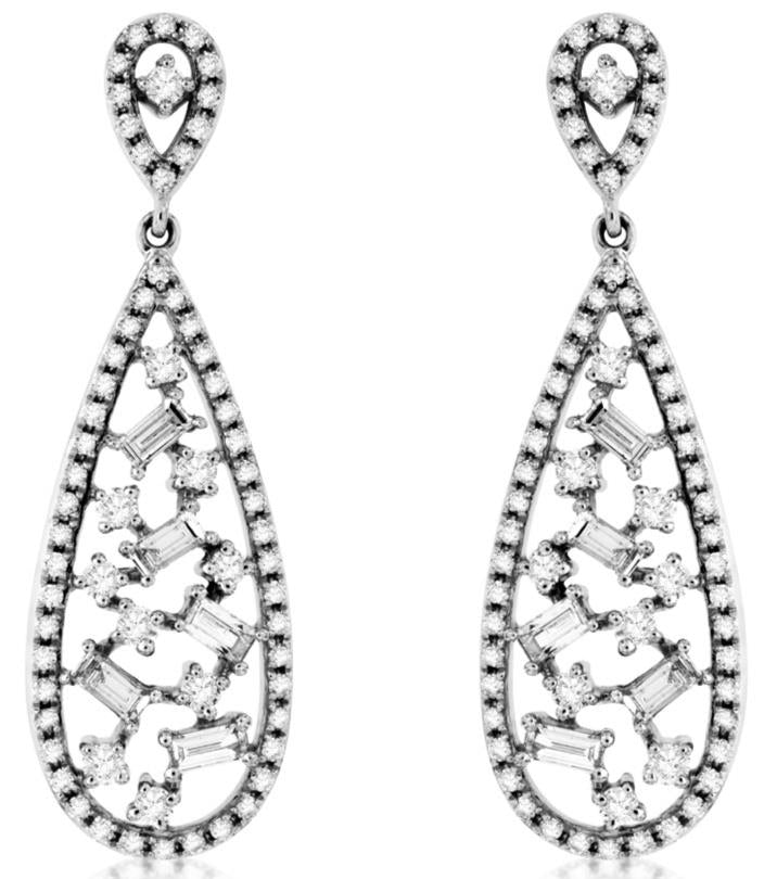 14KT WHITE GOLD HANGING EARRINGS. 3D CLUSTER TEAR DROP DESIGN. ROUND AND BAGUETTE DIAMONDS ARE F/G COLOR, VSSI CLARITY .52 CARATS. WRITTEN APPRAISAL AVAILABLE. COMES IN A PRESENTABLE GIFT BOX.