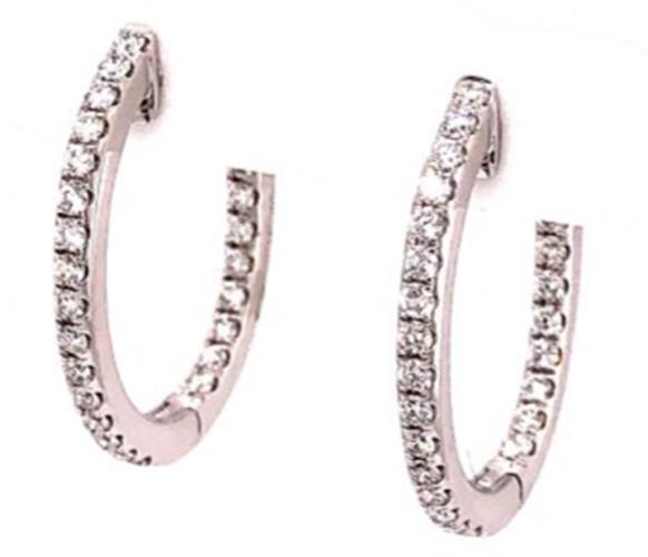18KT WHITE GOLD HOOP HANGING EARRINGS. 3D CLASSIC INSIDE OUT OVAL DESIGN. DIAMONDS ARE F/G COLOR, VSSI CLARITY .83 CARATS. WRITTEN APPRAISAL AVAILABLE. COMES IN A PRESENTABLE GIFT BOX.