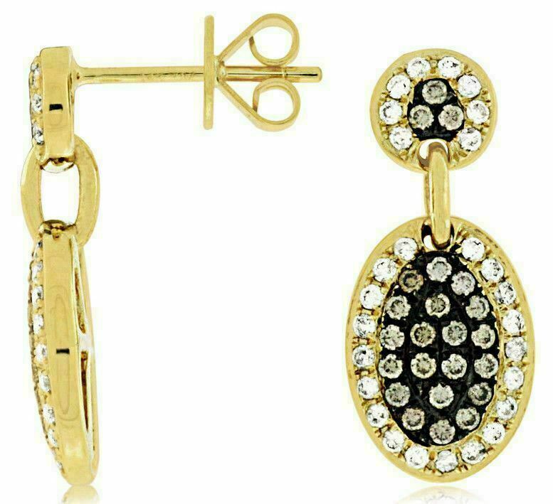 14KT YELLOW GOLD HANGING EARRINGS. 3D OVAL CLUSTER DESIGN. DIAMONDS ARE F/G COLOR, VSSI CLARITY .40 CARATS. CHOCOLATE FANCY DIAMONDS ARE .43 CARATS. WRITTEN APPRAISAL AVAILABLE. COMES IN A PRESENTABLE GIFT BOX.
