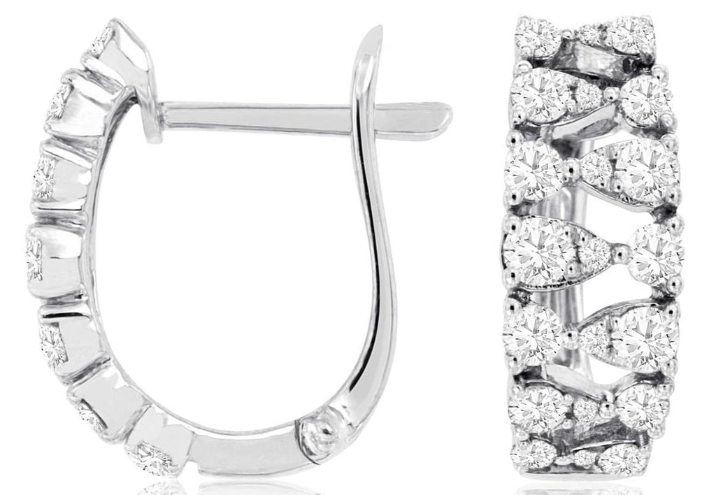 14KT WHITE GOLD LEVERBACK HANGING EARRINGS. 3D PEAR SHAPE AND OVAL DESIGN. ROUND DIAMONDS ARE F/G COLOR, VSSI CLARITY .84 CARATS. WRITTEN APPRAISAL AVAILABLE. COMES IN A PRESENTABLE GIFT BOX.