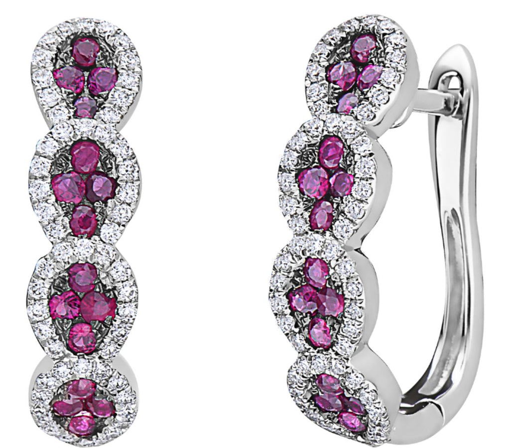 18KT WHITE GOLD LEVERBACK HUGGIE HANGING EARRINGS. 3D TEAR DROP DESIGN. DIAMONDS ARE F/G COLOR, VSSI CLARITY .32 CARATS. AAA RUBIES ARE .52 CARATS. WRITTEN APPRAISAL AVAILABLE. COMES IN A PRESENTABLE GIFT BOX.