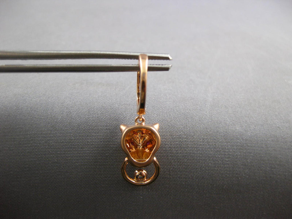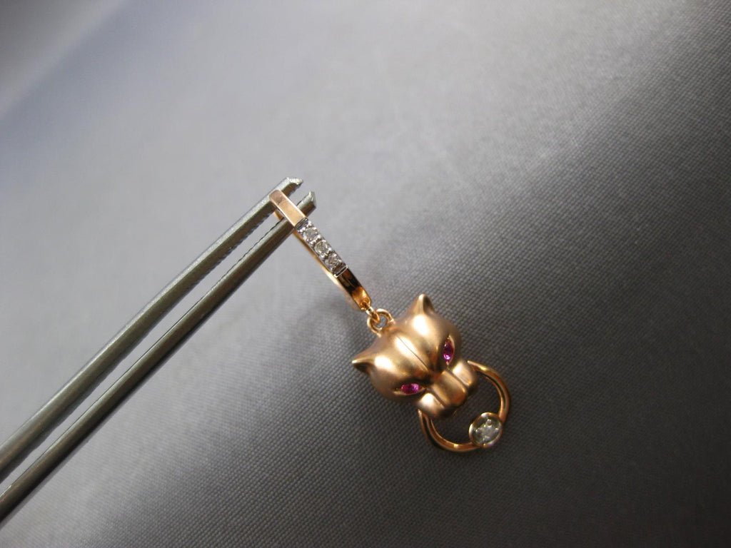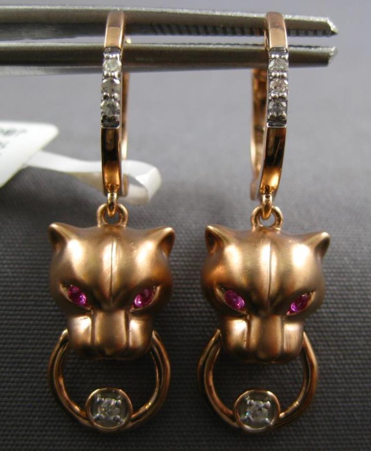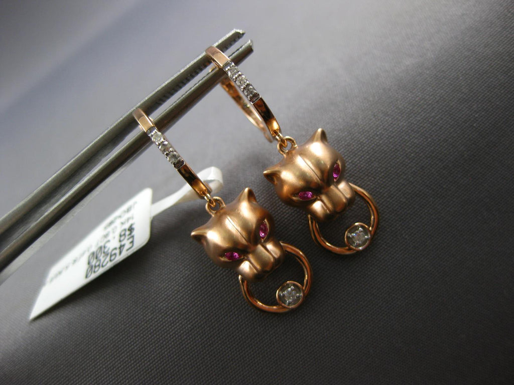 14KT ROSE GOLD FUN HANGING EARRINGS. 3D HAPPY PANTHER DESIGN. DIAMONDS ARE F/G COLOR, VSSI CLARITY .80 CARATS. AAA PINK RUBIES ARE .06 CARATS. MEASURES 29mm X 9mm. WRITTEN APPRAISAL AVAILABLE. COMES IN A PRESENTABLE GIFT BOX.