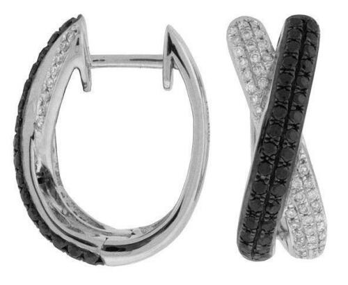 14KT WHITE GOLD HUGGIE HOOP EARRINGS. 3D MULTI ROW X LOVE DESIGN. WHITE DIAMONDS ARE F/G COLOR, VSSI CLARITY .26 CARATS. BLACK DIAMONDS ARE .60 CARATS. WRITTEN APPRAISAL AVAILABLE. COMES IN A PRESENTABLE GIFT BOX.
