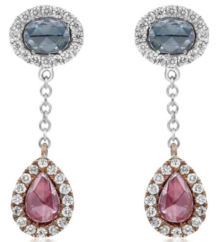 .88CT WHITE BLUE & RED ROSE CUT DIAMOND 18KT WHITE & ROSE GOLD HANGING EARRINGS