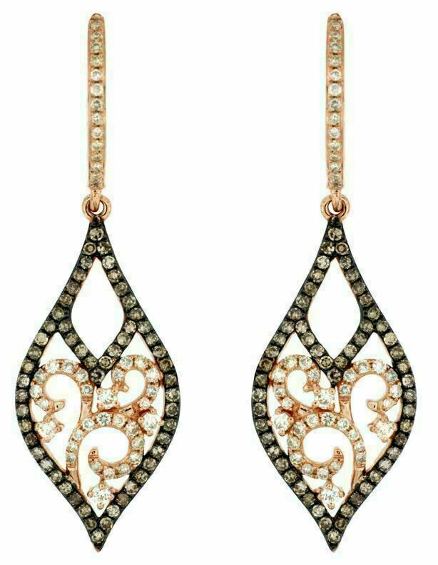 14KT ROSE GOLD HANGING EARRINGS. 3D OPEN FILIGREE TEAR DROP DESIGN. WHITE DIAMONDS ARE F/G COLOR, VSSI CLARITY .40 CARATS. CHOCOLATE FANCY DIAMONDS ARE .48 CARATS. WRITTEN APPRAISAL AVAILABLE. COMES IN A PRESENTABLE GIFT BOX.