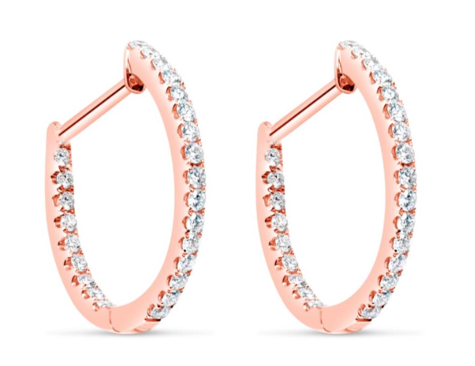 18KT ROSE GOLD HOOP HANGING EARRINGS. 3D CLASSIC INSIDE OUT OVAL DESIGN. DIAMONDS ARE F/G COLOR, VSSI CLARITY .89 CARATS. WRITTEN APPRAISAL AVAILABLE. COMES IN A PRESENTABLE GIFT BOX.