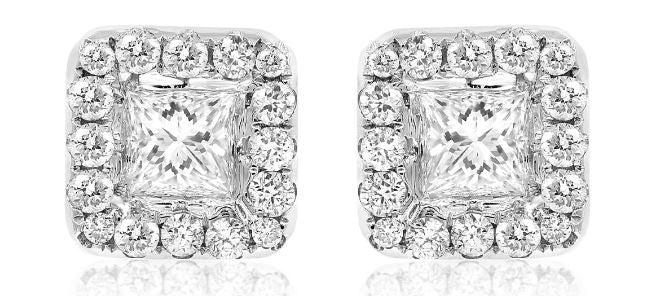 14KT WHITE GOLD STUD EARRINGS. 3D SQUARE HALO CLASSIC DESIGN. DIAMONDS ARE F/G COLOR, VSSI CLARITY. CENTER PRINCESS CUT DIAMONDS ARE .60 CARATS. ROUND DIAMONDS ARE .28 CARATS. WRITTEN APPRAISAL AVAILABLE. COMES IN A PRESENTABLE GIFT BOX.