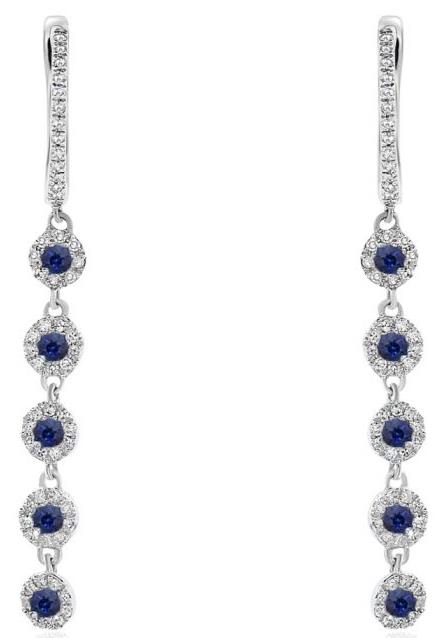 14KT WHITE GOLD LEVERBACK HANGING EARRINGS. 3D MULTI FLOWER JOURNEY DESIGN. DIAMONDS ARE F/G COLOR, VSSI CLARITY .32 CARATS. AAA SAPPHIRES ARE .36 CARATS. WRITTEN APPRAISAL AVAILABLE. COMES IN A PRESENTABLE GIFT BOX.