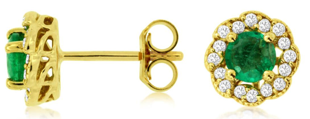 14KT YELLOW GOLD STUD EARRINGS. 3D FLOWER FILIGREE DESIGN. DIAMONDS ARE F/G COLOR, VSSI CLARITY .20 CARATS. AAA EMERALDS ARE .70 CARATS. WRITTEN APPRAISAL AVAILABLE. COMES IN A PRESENTABLE GIFT BOX.