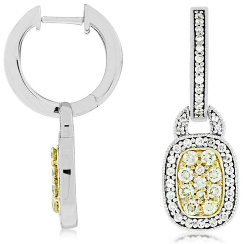 14KT WHITE GOLD HUGGIE HANGING EARRINGS. 3D CLUSTER SQUARE MILGRAIN FILIGREE DESIGN. WHITE DIAMONDS ARE F/G COLOR, VSSI CLARITY .40 CARATS. FANCY YELLOW DIAMONDS ARE .50 CARATS. WRITTEN APPRAISAL AVAILABLE. COMES IN A PRESENTABLE GIFT BOX.